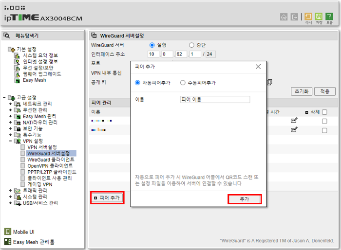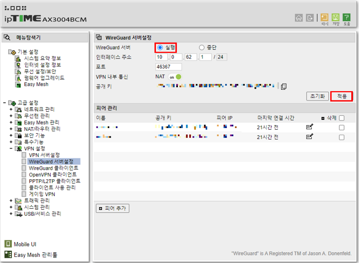 [iptime 관리페이지 - VPN 설정 - WireGuard 서버설정]