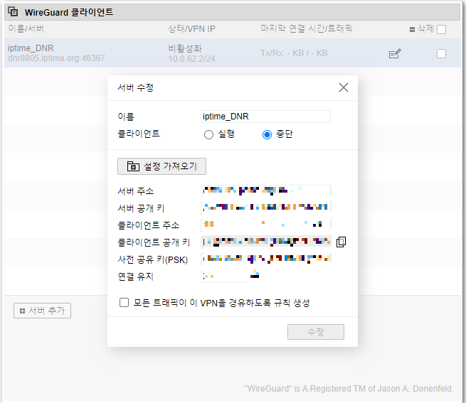 [iptime 관리페이지 - VPN 설정 - WireGuard 클라이언트]